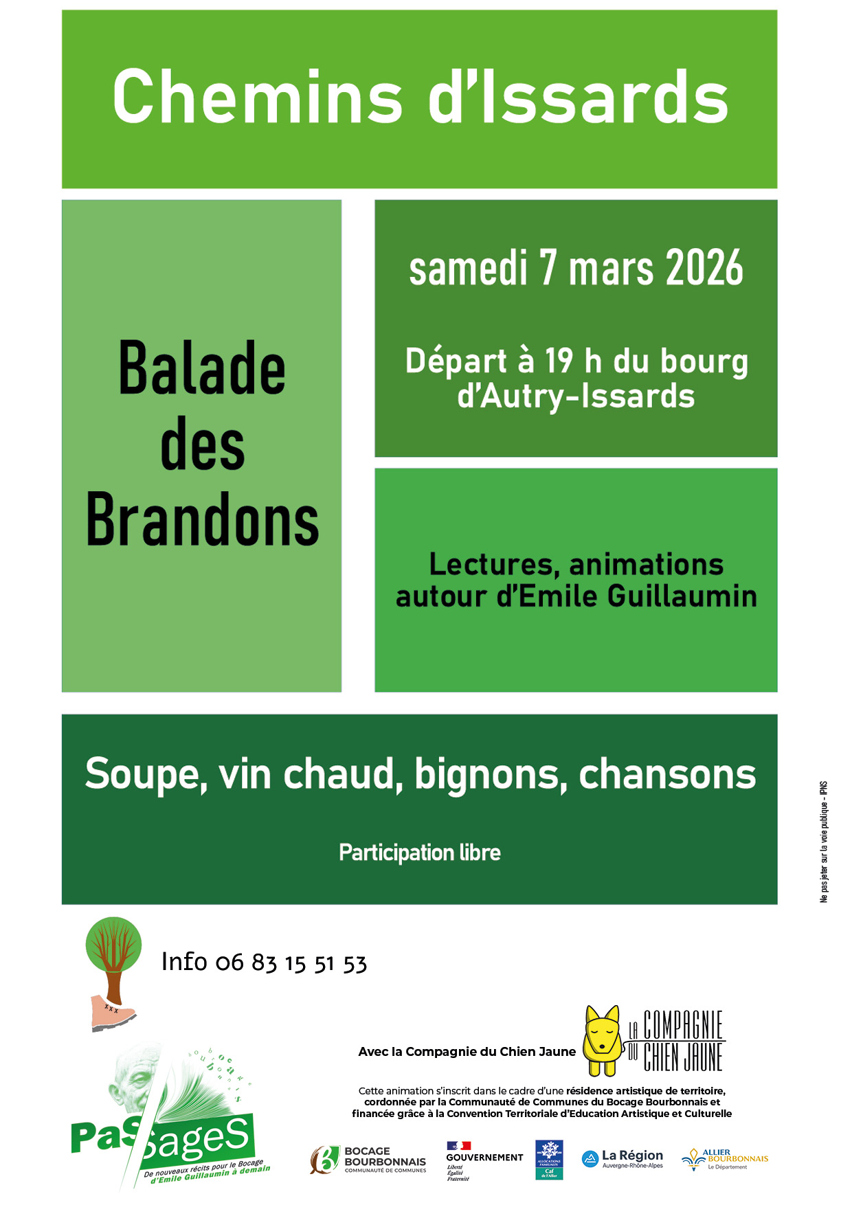 L'association Chemins d'Issards organise sa traditionnelle Fête des Brandons ! Rendez-vous le samedi 7 mars, au bourg d' Autry-Issards Accueil du public à partir de 18h30 Départ de la balade à 19h précises - Place de l'Eglise La balade d'environ 6 km permettra aux participants d'arpenter Autry-Issards, flambeaux en mains, à la découverte du Chemin des Trognes. Cette année, la traditionnelle soirée sera ponctuée de lectures de textes d'Emile Guillaumin par la Compagnie du Chien Jaune, actuellement en résidence artistique sur le territoire du Bocage Bourbonnais via la ComCom'. Guitare en mains, François Bourcheix interprètera quelques chansons de Gaston Coutet. Les Chants d'Issards, sous la direction de Pieter Kuipers, feront chanter le public sur des refrains de chansons françaises. Alain Mazerolles apportera également sa touche musicale à la soirée. L'arrivée de la balade marquera le début d'une soirée festive, dans un lieu insolite, où soupe, vin chaud et bignons seront servis à tous. INFOS PRATIQUES : Participation libre, au chapeau. Venez chaussés de manière adaptée, les chemins seront sans doute boueux. Pour les petits randonneurs, préférez les porte-bébés, plutôt que les poussettes. En cas de mauvais de temps, seule la soirée conviviale aura lieu, à partir de 19h également. Gabrielle et Marie-Claude ![]() | ||